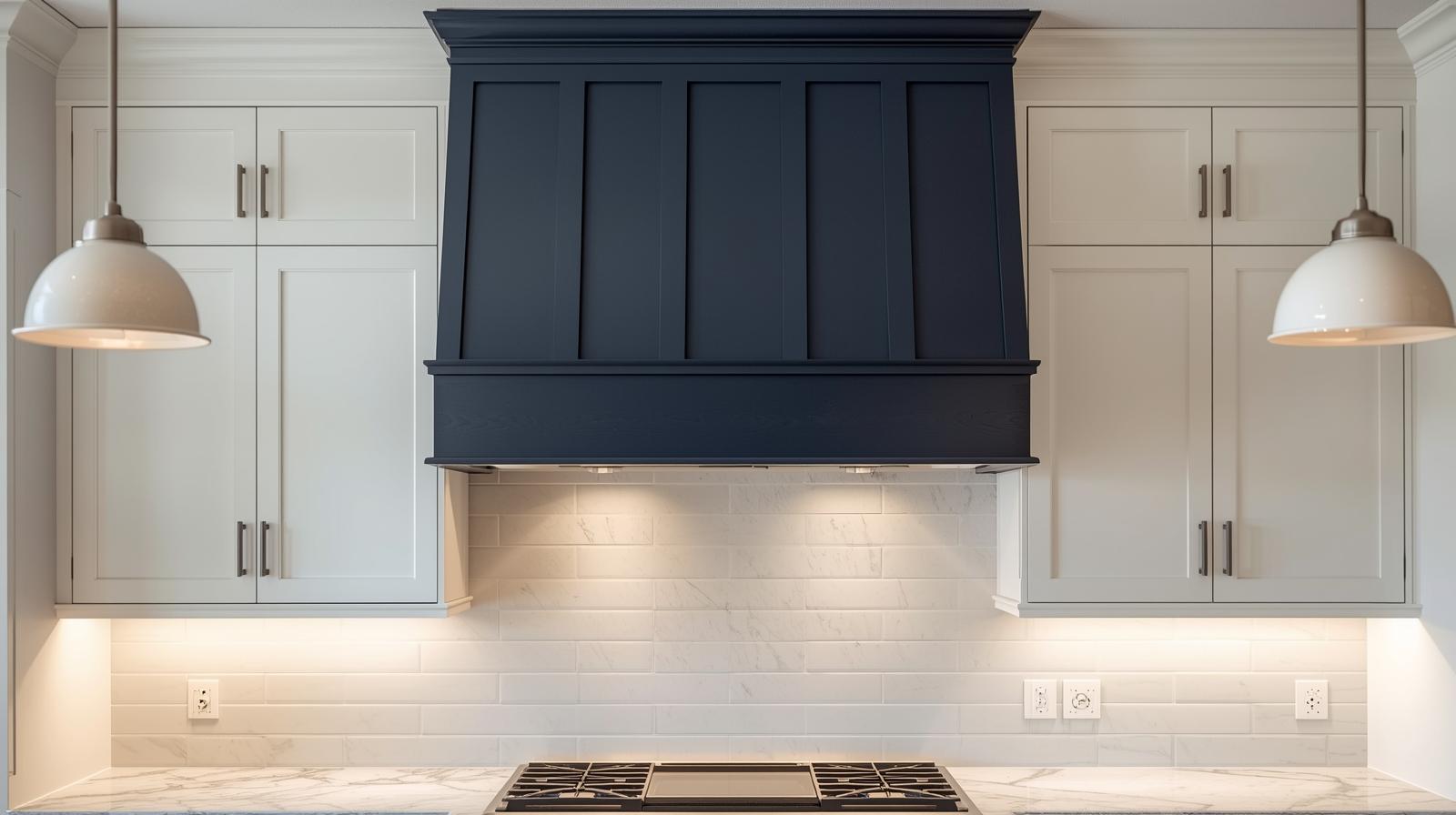 Matte black is a powerful design choice for a vent hood cover, creating a bold anchor point in the kitchen. It pairs strikingly with white or light grey cabinets and acts as a visual centerpiece above the stove. Add simple crown molding and panel details in the same matte black finish for a sleek, high-end look that feels intentional and dramatic.
