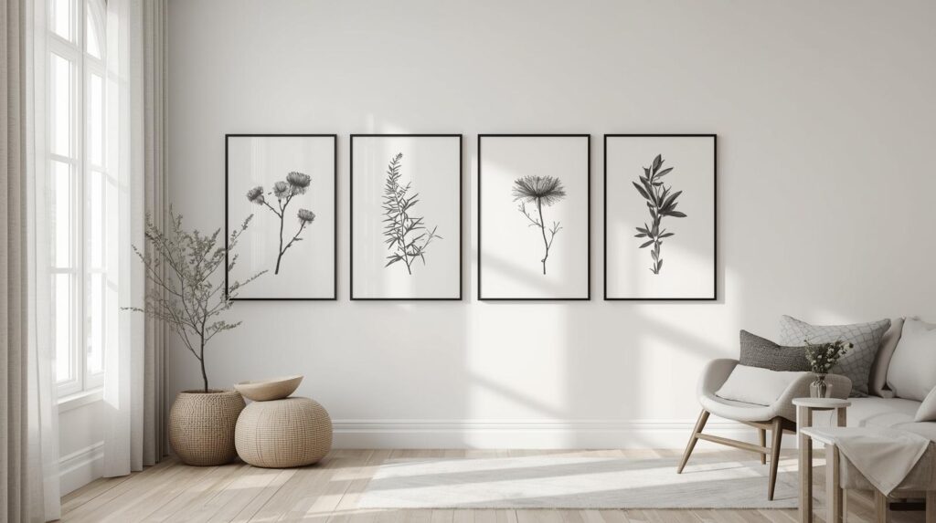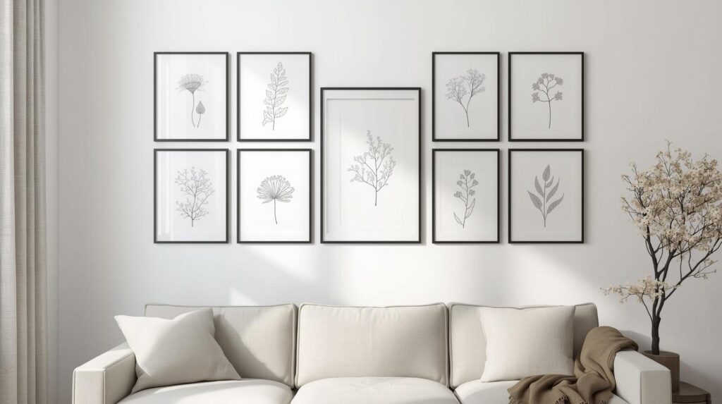A well-curated gallery wall using identical frames creates visual cohesion that feels intentional and expansive rather than cluttered. Stick to black, white, or natural wood frames in one size or two complementary sizes. Fill them with botanical prints, simple line art, or monochromatic photography. The repetition of matching frames creates rhythm across the wall, guiding the eye in a structured pattern that makes the space feel organized and larger.