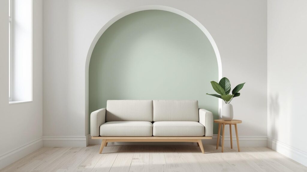 Painting an arch or curved panel directly onto the wall is a budget-friendly architectural trick that adds depth and sophistication to small spaces. Use a tone slightly deeper or warmer than your main wall color — dusty terracotta, sage green, or soft clay work beautifully. The curved shape mimics architectural detailing and creates a focal point that pulls attention forward, giving the room a designed, layered quality that feels anything but small.