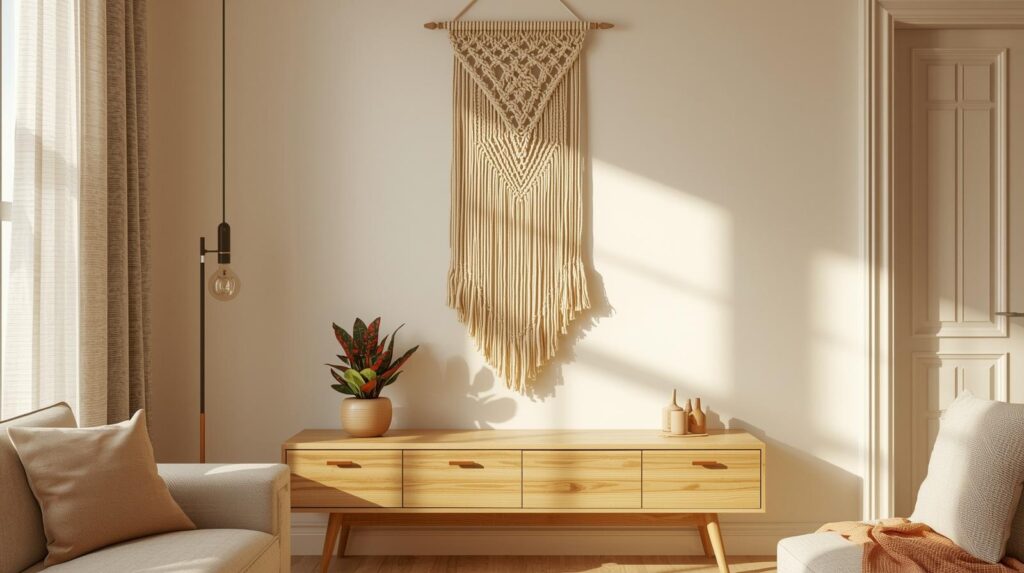 A tall, narrow macramé wall hanging adds bohemian warmth and vertical emphasis to a small living room without overwhelming the space. Choose a piece in natural cotton or jute with elongated fringe and open knotted patterns that allow the wall color to show through. The openwork texture creates visual interest without adding visual bulk. Hang it on a plain wall above a console or sofa to anchor the space with artisan character.