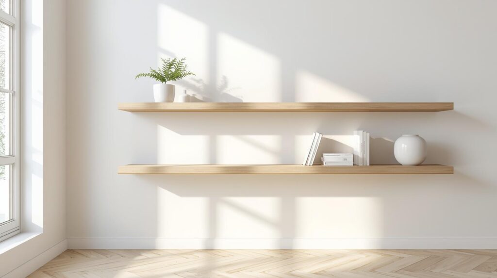 Floating shelves installed on a living room wall serve double duty — they provide storage while drawing the eye horizontally across the wall, making the room feel wider. Keep styling intentional and sparse: one small plant, a few books stacked vertically, a single ceramic object. Avoid overcrowding. The negative space between objects is just as important as the objects themselves, keeping the overall look airy and visually light.