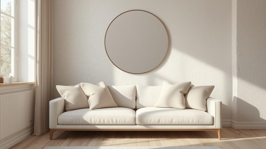 A large round mirror mounted on the main living room wall is one of the most powerful space-expanding tools in interior design. It reflects natural light, doubles the visual depth of the room, and adds a sculptural quality to bare walls. Choose a slim gold, black, or rattan frame to keep it elegant without adding visual weight. Position it opposite a window to maximize the light-reflecting effect throughout the day.