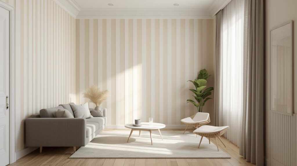 Vertical stripes painted or wallpapered onto a living room wall are one of the oldest and most effective tricks for making ceilings feel taller. Choose two tones close in value — soft white paired with warm cream, or pale grey with cool white — for a subtle, sophisticated effect. The eye naturally travels upward along the lines, elongating the entire room. Keep furniture low-profile to amplify the height illusion even further.