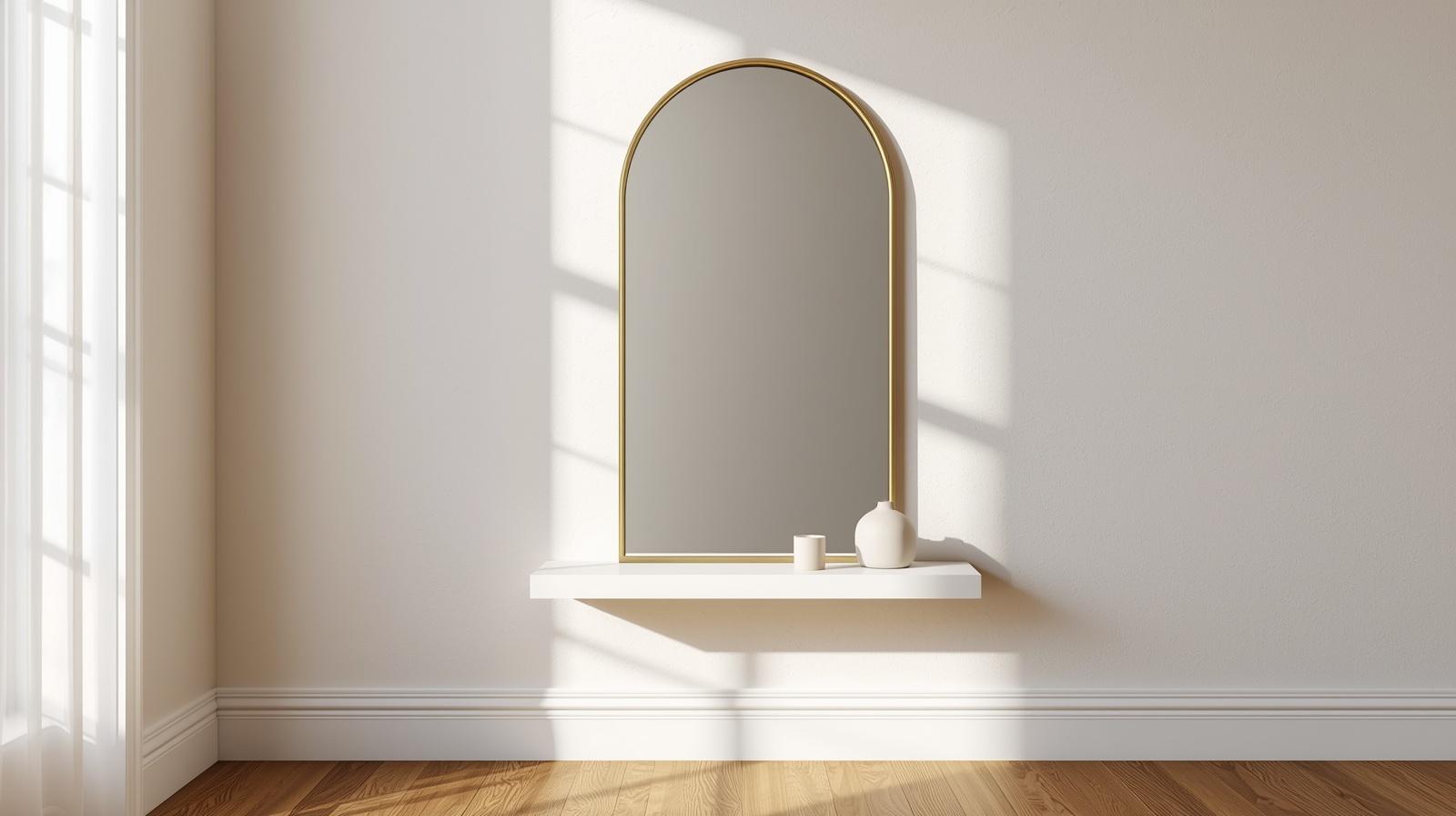 Pairing a tall arched mirror with a slim floating shelf directly beneath creates a complete, styled wall vignette that functions beautifully in small spaces. The arch shape adds architectural softness while the mirror’s height elongates the wall dramatically. Style the shelf with just two or three objects — a small candle, a bud vase, a trailing plant. The combination feels complete, intentional, and visually draws the eye both upward and across.