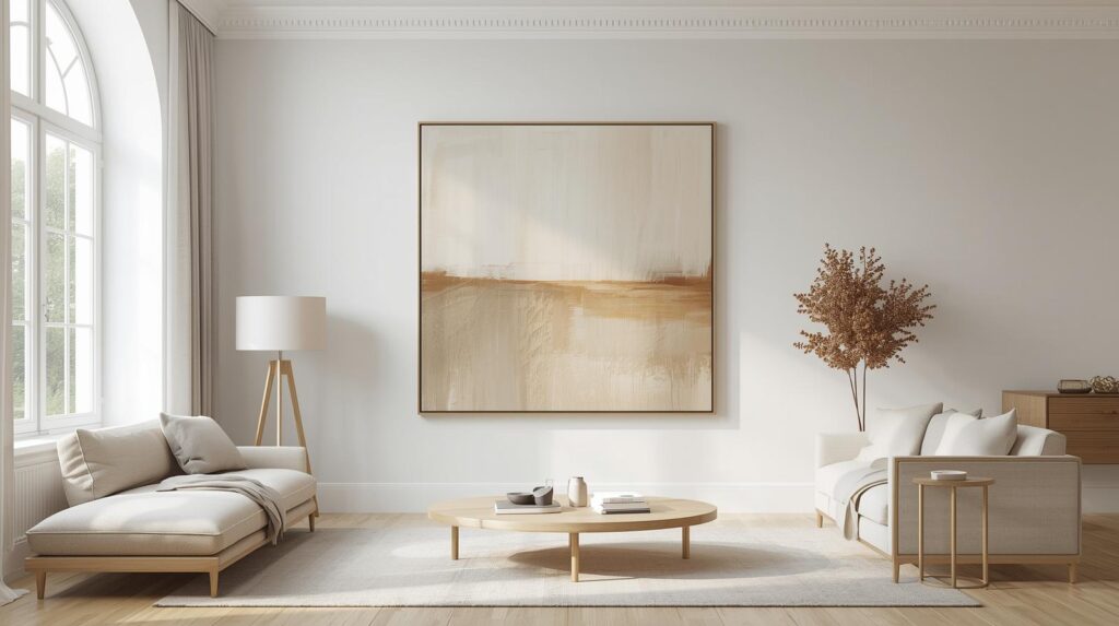 One oversized artwork does more for a small living room than a dozen smaller pieces ever could. A large abstract canvas in soft neutrals, warm whites, or muted earth tones draws the eye upward and outward, creating an instant sense of expanded space. Choose loose brushstroke styles or minimalist compositions that feel airy rather than heavy. The visual openness of abstract art makes walls breathe instead of close in.