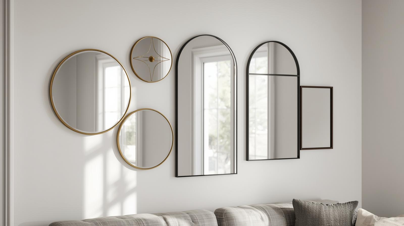 Instead of one large mirror, clustering several mirrors of different shapes and sizes creates a dynamic, light-multiplying wall feature. Mix round, arched, and rectangular mirrors in complementary finishes — brass, black, or antique silver. The multi-mirror arrangement reflects light from multiple angles, dramatically brightening the room and creating the illusion of windows where none exist. Keep frames slim and spacing tight for a curated, intentional composition.
