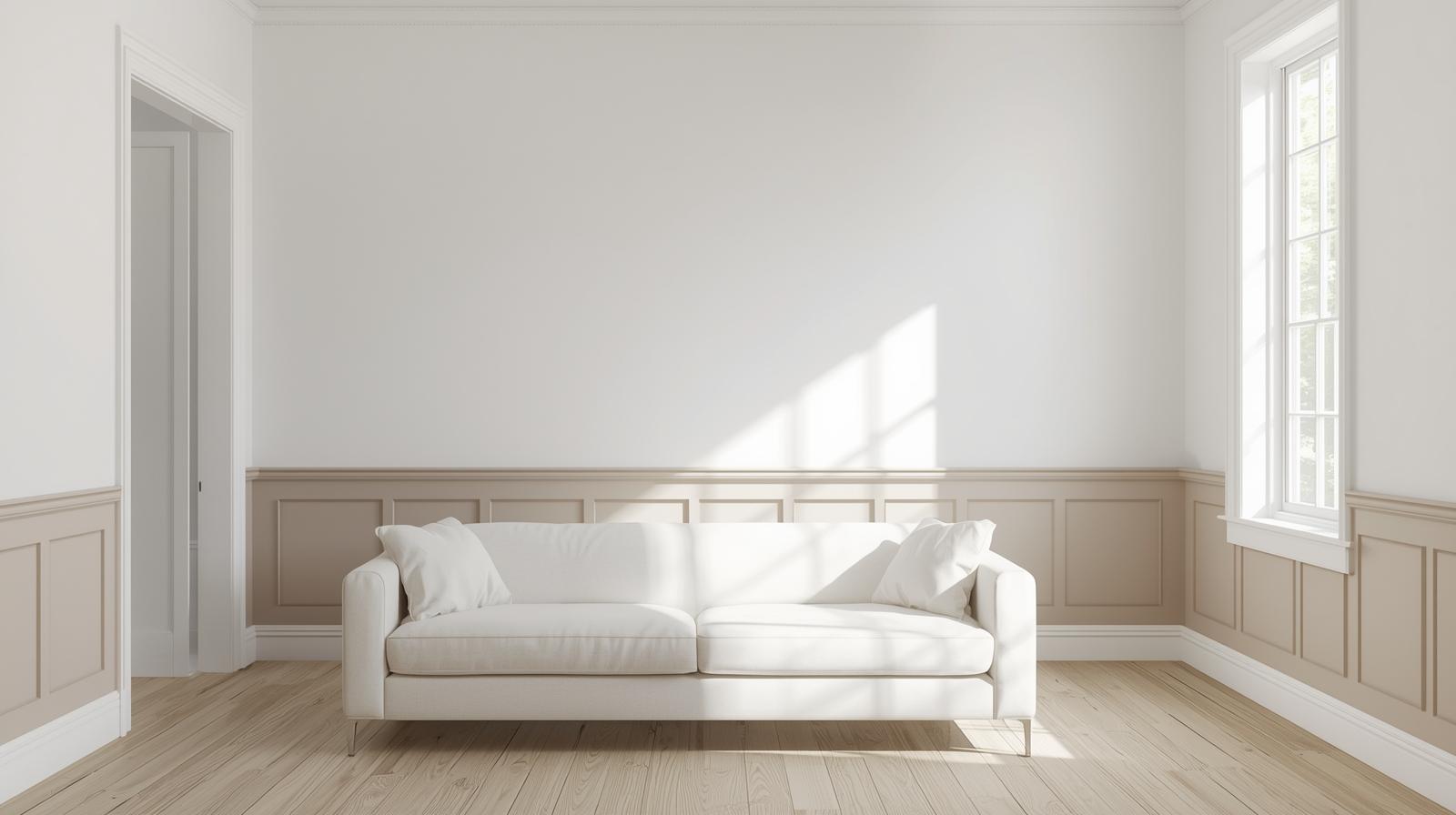 A painted dado rail dividing the wall into two tones — a lighter upper half and a slightly deeper lower half — adds architectural character and visual structure to a plain living room. Use soft white on top with warm greige, dusty sage, or pale clay below. The horizontal divide makes the room feel deliberately designed and the lighter upper portion draws the eye upward, making the ceiling feel higher than it actually is.