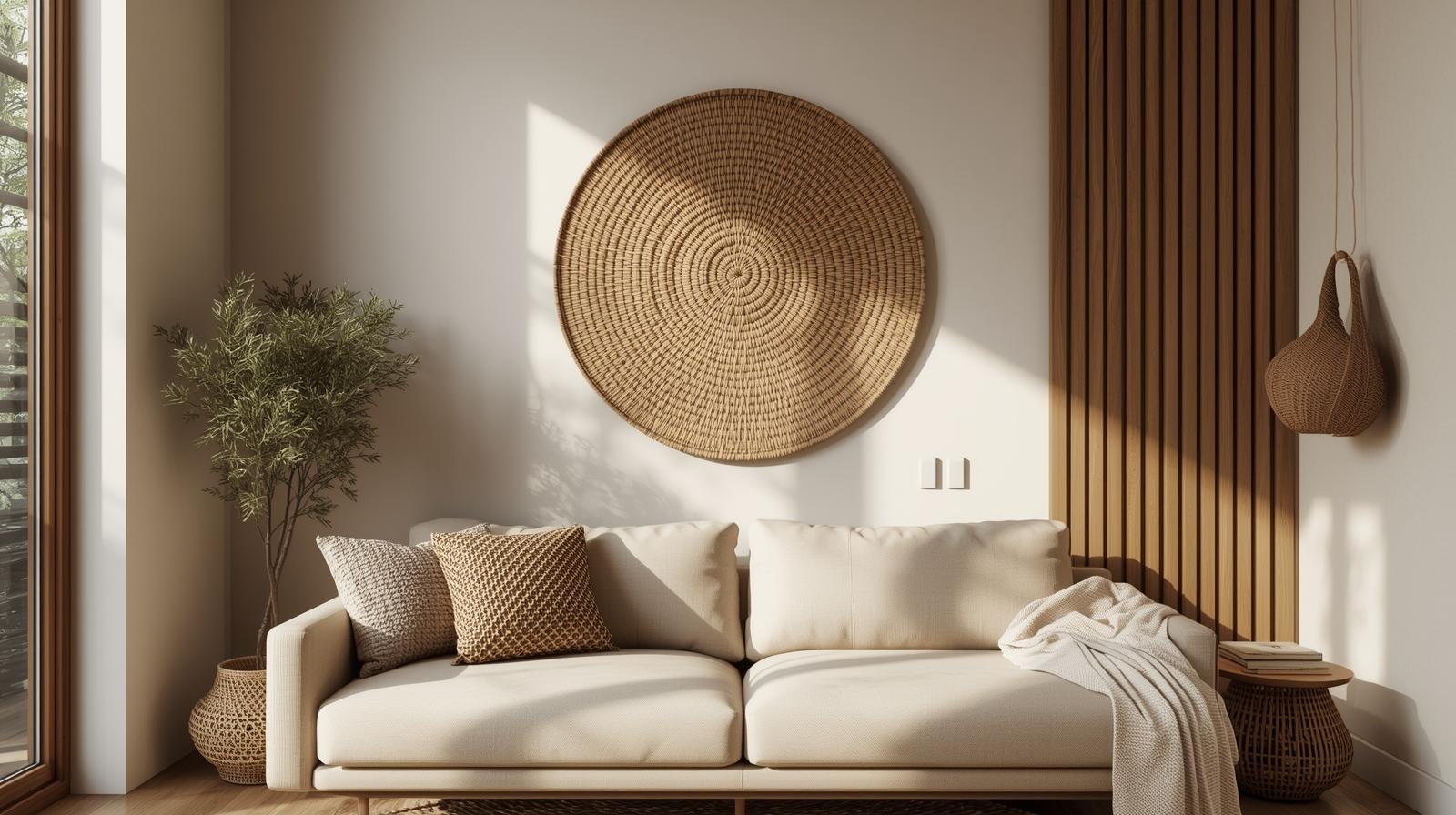A large woven rattan or seagrass wall disc brings natural warmth and organic texture to a living room wall without adding visual heaviness. The circular shape softens sharp-cornered rooms and adds a sculptural quality that feels both bohemian and sophisticated. Choose a disc at least 24 inches in diameter for maximum impact. The open weave pattern allows the wall color to peek through, keeping the overall look light, airy, and effortlessly stylish.